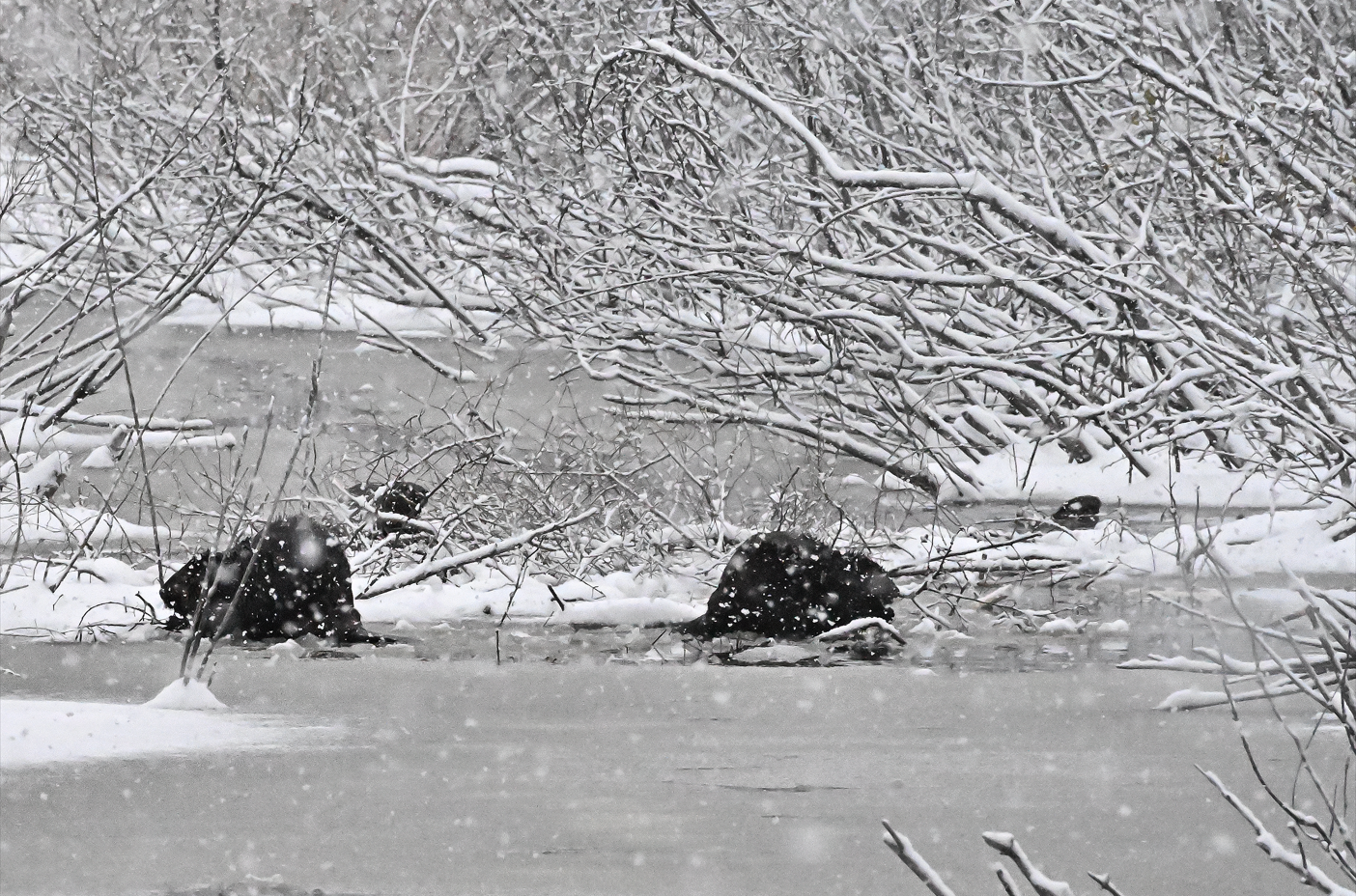 November 30, 2025. Beavers. There are actually four beavers in this shot - if it's dark, it's a beaver. They were doing a lot of work storing food while it snowed. The forest in the snowfall was beautiful but a challenge to photograph in the low light. #SDDaily #photography #beaver #forest. URL: https://ift.tt/MeVIXkY